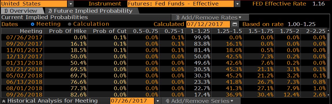 Comme vous pouvez le voir, au moment de la rédaction du présent rapport, le marché avait peu de chance d'obtenir une hausse des taux américains en juillet ou en septembre, mais une possibilité de mouvement avant septembre 2018 était élevée. Cela signifie que si le dollar doit gagner en raison du resserrement de FED, le marché doit être convaincu que plus qu'une hausse aura lieu au cours de la période d'analyse.