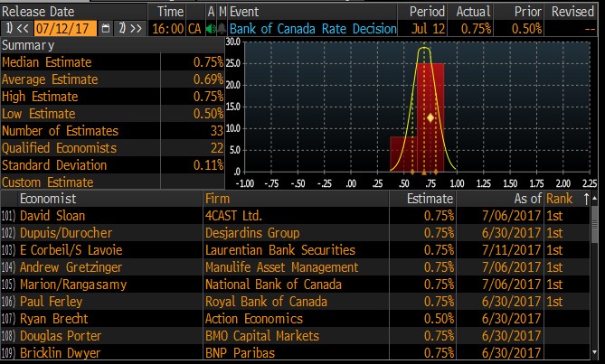 Qui plus est, les attentes pourraient également se rapporter à une réunion spécifique. Regardons le tableau ci-dessous. Il montre le consensus avant la décision de la Banque du Canada sur les taux d'intérêt. Comme vous pouvez le constater, la plupart des économistes s'attendaient à une hausse des taux de la part de la BdC, mais d'autres non.