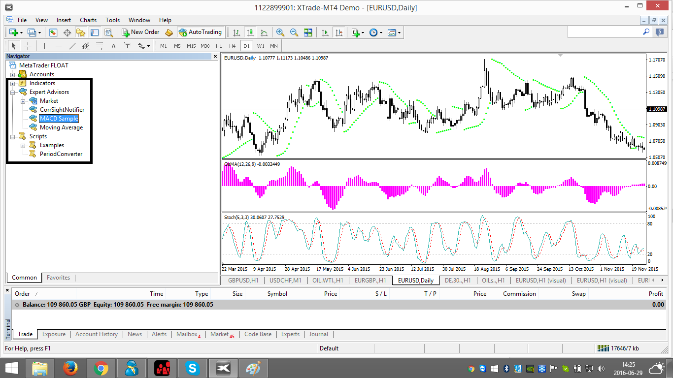 Une fois que l’outil technique est enregistré, vous serez en mesure de le trouver dans la plateforme de Trading en ouvrant l’onglet « Navigator ». Cette section peut également être ouverte via le raccourci clavier CTRL + N ou via l’option « Navigator » dans l’onglet « View ». Quand cet onglet est ouvert, l’outil technique est soit dans la section des indicateurs, soit dans celle des scripts, soit bien évidemment dans celle dédiée aux experts advisors.