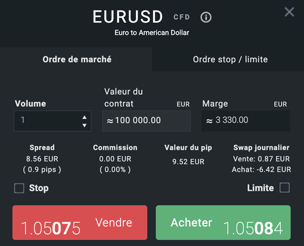 Par exemple, l’EURUSD est coté au prix de vente de 1,099 52. Le pip est la 4e décimale soit le 5 dans notre exemple. Si le prix d’achat est de 1,099 64 et que vous êtes intéressé pour calculer le spread sur ce marché, vous devez simplement soustraire 1,099 52 de 1,099 64 et vous obtenez un spread de 1,2 point (ou « pips »).