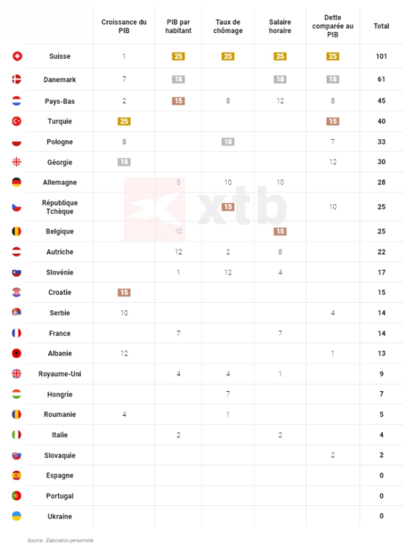 Avec les résultats du tableau, la Suisse se positionne comme la grande gagnante de « l’euro économique 2024 », avec un total de 101 points selon notre système de mesure. Elle est suivie par le Danemark, qui avec 61 points parvient à se hisser à la deuxième place, et par les Pays-Bas, qui complètent le podium avec 45 points. L'Espagne, en revanche, occupe la troisième place avec 0 point, tout comme le Portugal et l'Ukraine en bas du classement.