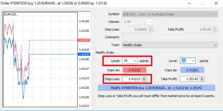 La fenêtre de modification d’ordre apparaîtra et à ce moment-là vous pouvez introduire ou modifier les SL/TP avec le niveau souhaité ou en définissant le nombre de points à partir du cours actuel du marché.
