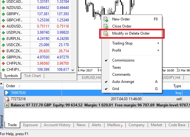 Vous pouvez également faire cela à partir du module ‘Terminal’ en bas de la plateforme. Pour ajouter ou modifier les niveaux de SL/TP, faites un clique droit sur une position ouverte ou un ordre différé et choisissez ‘Modifier ou Annuler de l’ordre’.
