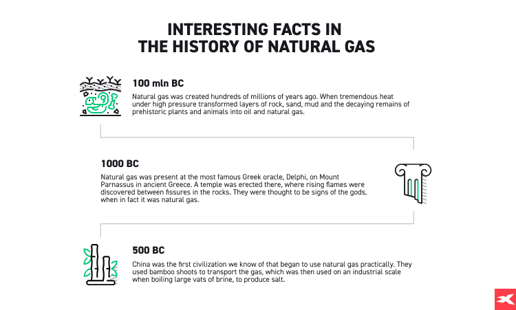 Autour des années 1000 avant J.-C., dans la Grèce antique, l'oracle de Delphes a été construit sur le mont Parnasse à un endroit qui s'est avéré être une source de gaz naturel. Vers 500 avant J.-C., les Chinois ont commencé à utiliser des "pipelines" en bambou pour transporter le gaz qui remontait à la surface. Les Chinois l'utilisaient pour faire bouillir l'eau de mer afin d'en faire de l'eau potable.