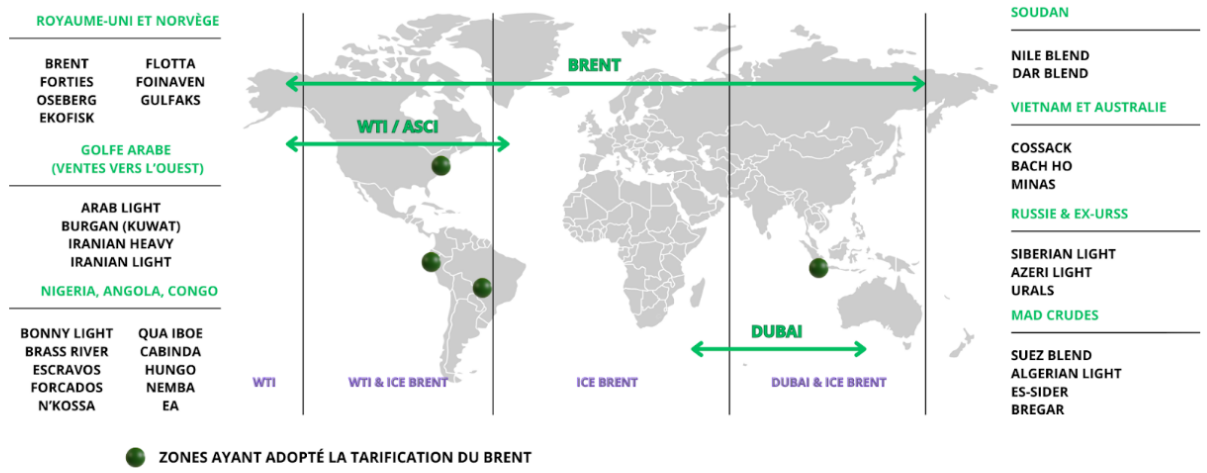 Le Brent et le West Texas Intermediate (WTI) sont les principales références pour les prix du pétrole brut, bien qu’il existe de nombreux autres types de pétrole, influencés par les propriétés spécifiques et le lieu d'extraction.