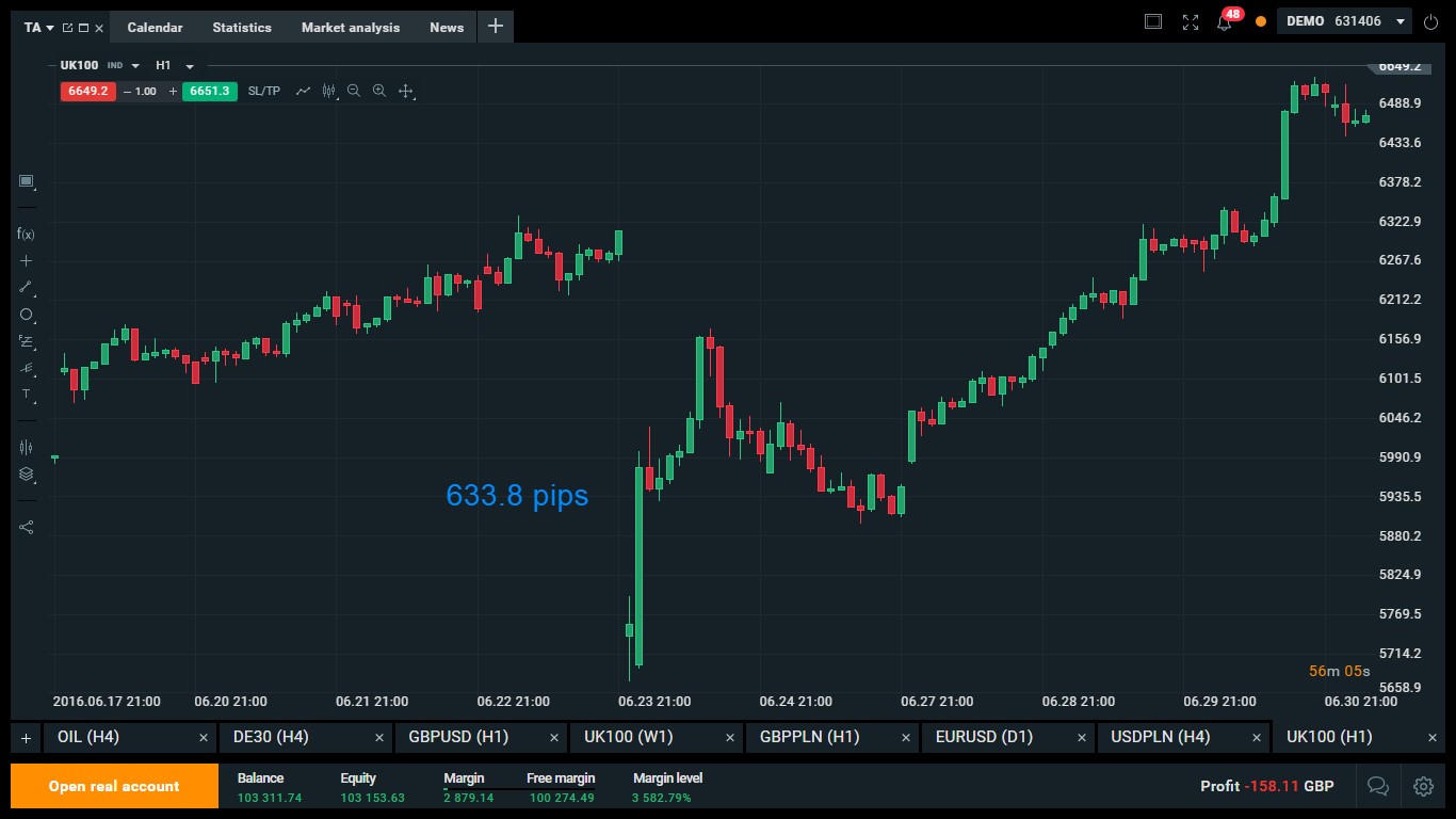 L’exemple ci-dessus est le résultat du référendum sur le Brexit, là ou le UK100 (FTSE, indice anglais) a chuté de plus de 600 points (pips) en moins d’une heure, ce qui atteste d’une augmentation de l’aversion au risque envers l’économie britannique à court terme.