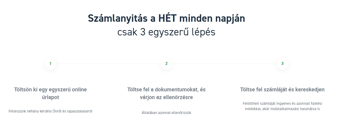 A számla megnyitása teljesen ingyenes, rejtet költségektől és kötelezettségektől mentes. Az online számla megnyitásának teljes folyamata, a regisztrációs űrlap kitöltésétől a személyazonosság megerősítéséig a vonatkozó dokumentumokkal és az ingyenes pénzbefizetéssel együtt, nem tart tovább pár percnél.