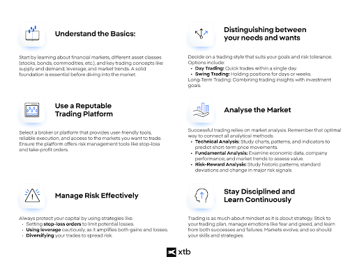 A kezdők megfelelő oktatással és felkészüléssel elkezdhetnek kereskedni. A kulcsfogalmak megértése, a demószámlákkal való gyakorlás és a kis összegekkel való kezdés nagyszerű módjai az elindulásnak.