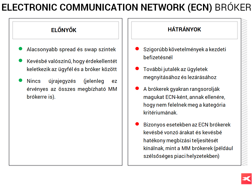 Electronic Communication Network (ECN) – Ez a típusú bróker kevésbé népszerűbb és gyakoribb, mint a Market Maker bróker. Az elektronikus kommunikációs hálózat modellje szerint működő brókerek ügynökként funkcionálnak, nem vesznek részt magában az ügyletben. Az ügyfél tranzakcióját a bróker továbbítja az Elektronikus Kommunikációs Hálózathoz - egy speciális platformhoz, amely összekapcsolja a likviditást nyújtókat a címzettekkel. A megrendelések ellenőrizhetőek a kötés táblázatban, amely minden piaci szereplő számára elérhető. A megbízásokat a likviditást szolgáltatók által kibocsátott legvonzóbb vételi / eladási áron teljesítik (ezek a legnagyobb globális bankok, mint például: JP Morgan, Goldman Sachs, Morgan Stanley és Deutsche Bank).