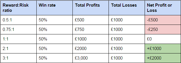 Alul láthatunk egy táblázatot, ami különböz hozam:kockázat arányokat mutat be, a táblázatban 1 az = 100 GBP-vel és 50% találati arányunk van 10 kereskedés után.