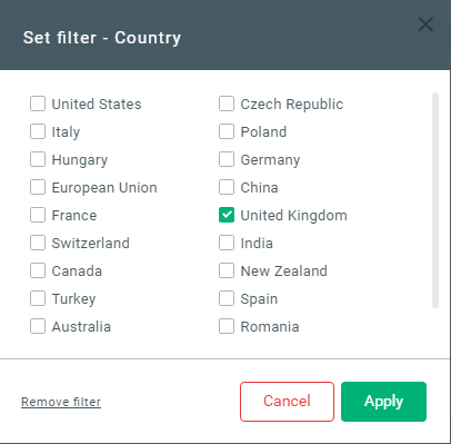 ‘Filter beállítása - felugrik az országok ablak: