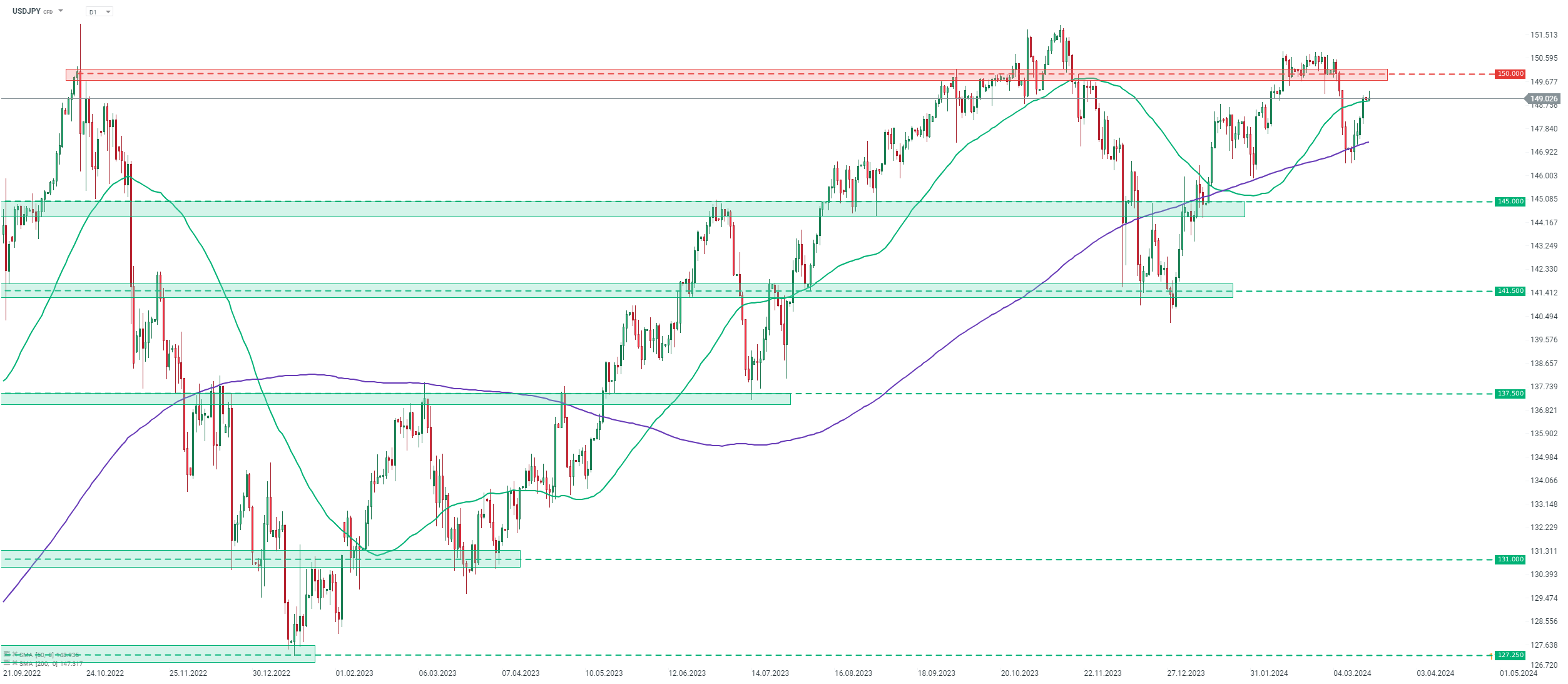 A japán jen erősödni kezdett, ahogy egyre nyilvánvalóbbá vált, hogy a Bank of Japan kamatemelést fog végrehajtani, az USDJPY árfolyama az 1951 körüli szintről 147 alá esett március első felében. A lefelé irányuló mozgás azonban később megállt, és a pár azóta visszanyerte a veszteségek nagy részét.