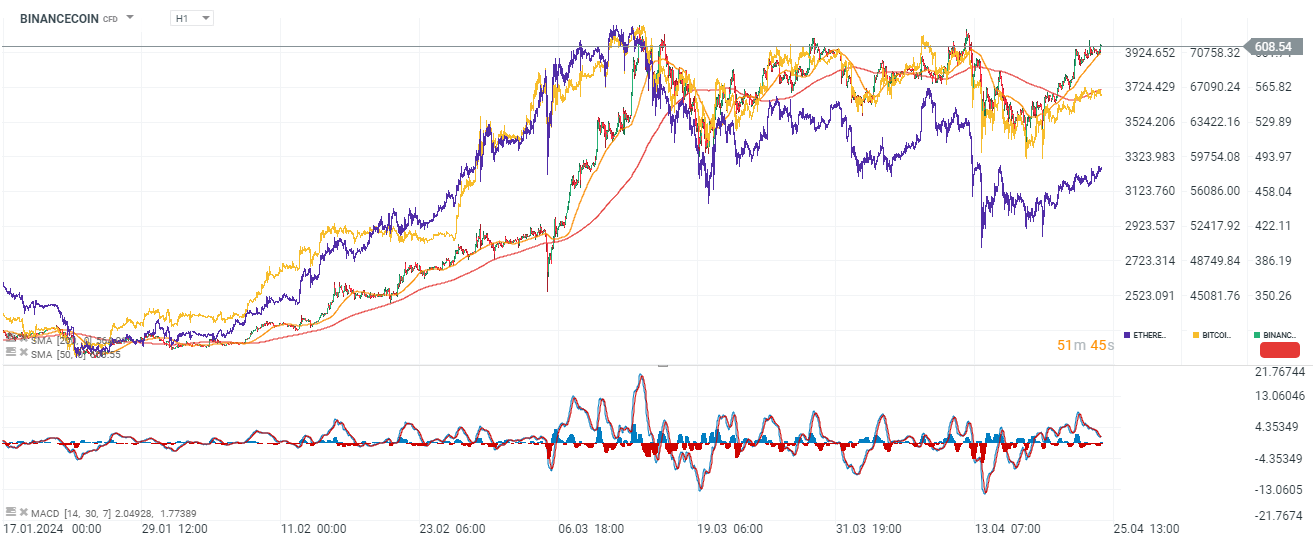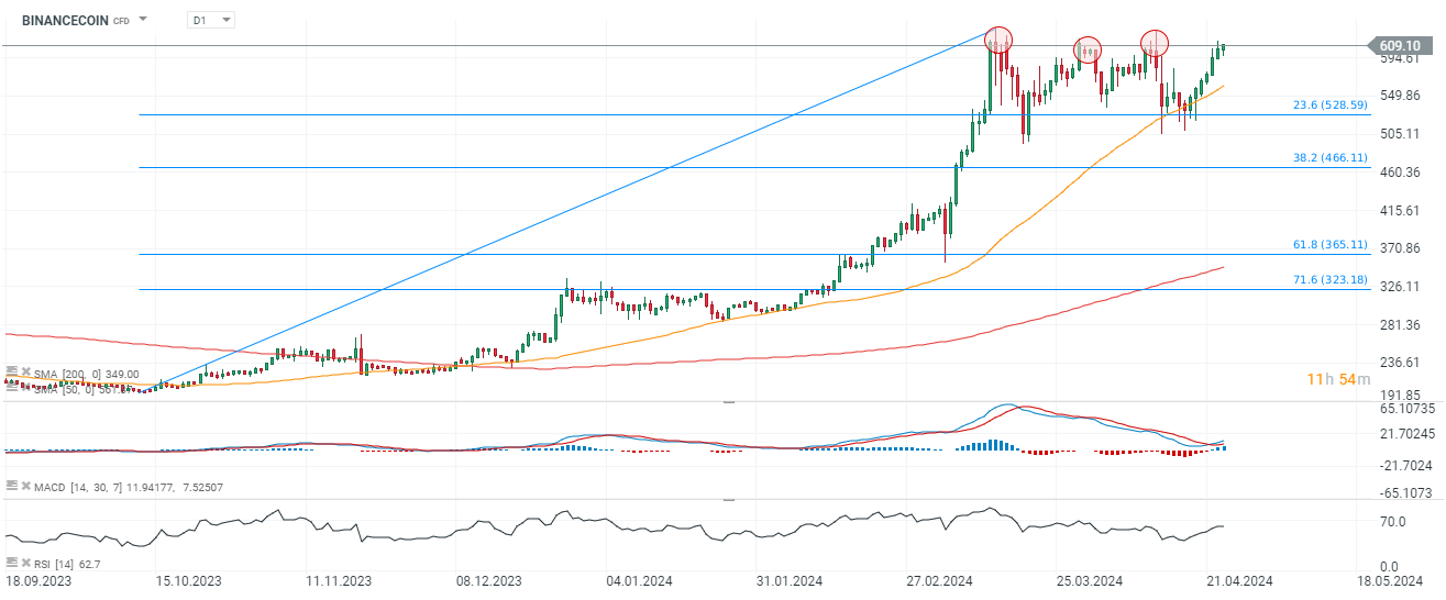 A Binancecoin megtartotta a 2022 decemberi felfelé irányuló hullám 23,6 Fibonacci retracementjének támogatását, és a BNB-nként 610 dolláron kereskedik, azaz egy olyan szinten, ahol történelmileg jelentős árreakciókat láttunk. Ennek eredményeképpen, ha a Bitcoin árfolyama zuhan, a volatilitás kiugrása és egy jelentős lefelé irányuló reakció nem lenne kizárt. Másrészt azonban a BTC az elmúlt napokban egyértelműen stabilizálódott, és a 70 000 dollár fölé való visszatérés a Binancecoint új történelmi csúcsokra emelheti, bár a legtöbb altcoin körül továbbra is vegyes a hangulat. A BNB az utóbbi időben óriási ellenálló képességről tett tanúbizonyságot, és gyorsan visszatért az ATH közeli szintekre, annak ellenére, hogy a BTC 20%-os korrekciót hajtott végre, és a fő kriptopénz ára még mindig közel 10%-kal alacsonyabb a márciusi csúcsokhoz képest.