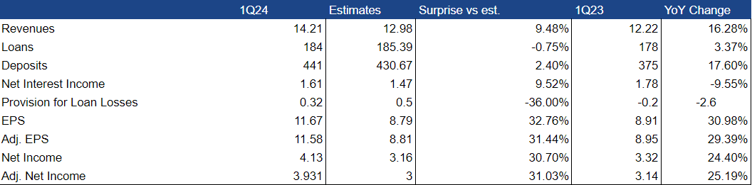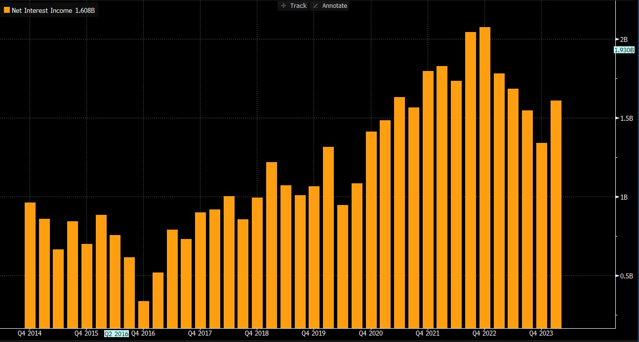 A vállalat q/q alapon 318 millió dollárra csökkentette hitelezési veszteségekre képzett céltartalékát (a 23 4Q-ban mért 577 millió dollárral szemben). Egy évvel korábban, ugyanebben az időszakban -171 millió dolláros eredményt jelentett, amely egy egyszeri eseményből, nevezetesen a Marcus portfólió részleges értékesítéséből eredt. Az idei tartalékérték jelentősen elmaradt a piaci várakozásoktól (-36% a várakozásokhoz képest).
