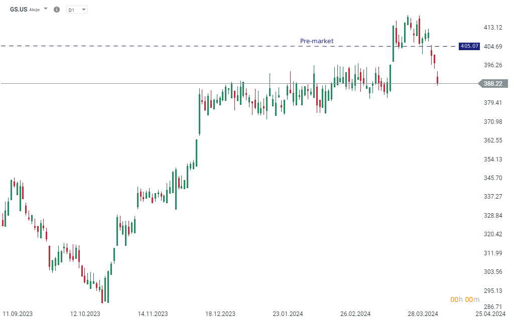 A Goldman Sachs eredményei után a részvény árfolyama erőteljesen emelkedett a kereskedés előtti kereskedésben. Az árfolyam eddig több mint 4%-kal emelkedett. Forrás: xStation