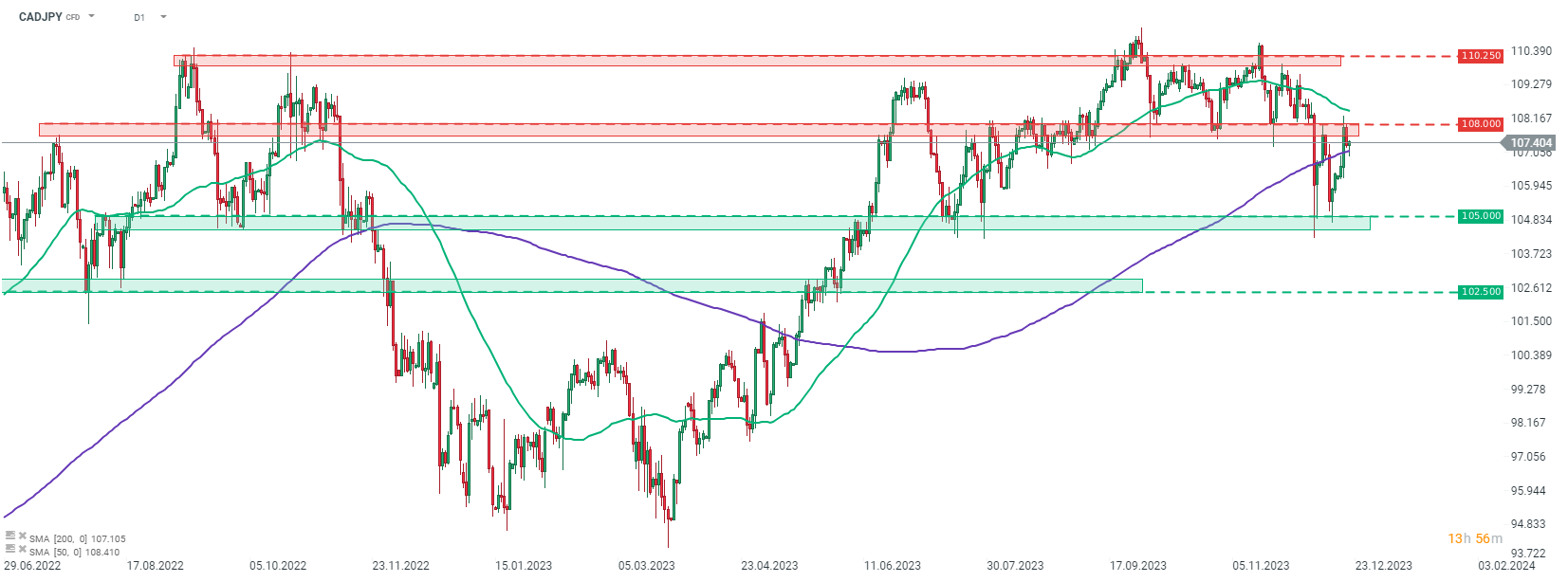 Ha megnézzük a CADJPY-t a D1 intervallumban, láthatjuk, hogy a pár nemrég lepattant a 105,00 támogatási zónáról, és a héten a 108,00 ellenállási zónába emelkedett. A bikáknak nem sikerült áttörniük ezt az akadályt, és visszahúzódás indult. Ez a visszahúzódás azonban ma megállt a 200-as ülés mozgóátlagnál (lila vonal), ami reményt ad a 108,00 ellenállás újabb tesztelésére. Amennyiben a kanadai kiskereskedelmi eladási adatok felülmúlják a várakozásokat, egy ilyen tesztre már ma délután sor kerülhet.