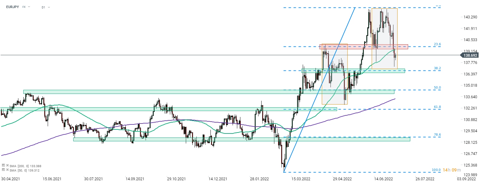 Taking a look at EURJPY chart at D1 interval, we can see that the common currency has lost some ground against the Japanese yen recently, even as JPY has been a rather weak performer recently. Nevertheless, uptrend seems to be still in play as the pair manages to stay above the lower limit of a market geometry in the 137.00 area, which is also marked with 38.2% retracement of the upward move started in March 2022. As long as the price stays above the 137.00 area, technical outlook continues to favor bulls.