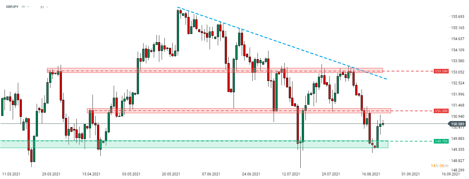 A GBPJPY 2021 május vége óta lefelé mozgott, ez azonban az előző hét végén megállt a 149,75-ös támaszzónánál. Ez volt a második alkalom, amikor ez a zóna megállította a csökkenést, és a folyamatos erős visszapattanás azt sugallta, hogy a lefelé irányuló trendvonal felé való elmozdulás közeledhet. A figyelemre méltó közeli ellenállás 151,20-nál található, és a korábbi árreakciókkal van jelölve. A fölé való áttörés megnyitná az utat a fent említett trendvonal felé, amely jelenleg a 152,70-es területen fut. Megjegyzendő, hogy a csökkenő trend érvénytelenítéséhez a 153,10-es helyi csúcsok fölé való áttörés lenne szükséges.
