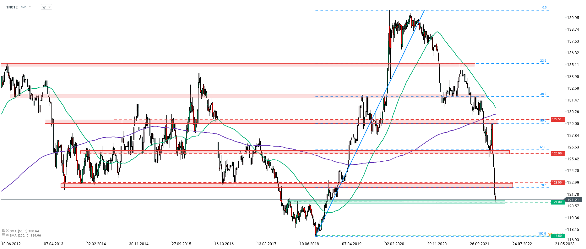 Taking a look at a weekly chart of US 10-year bond (TNOTE), we can see that price has been freefalling since the beginning of Russian invasion of Ukraine in late-February 2022. Following a strong downward move last Friday, price broke below the 78.6% retracement of the upward move launched in September 2018. Decline is being continue at the beginning of a new week with a test of the 121.00 support zone. A break below would open the way towards late-2018 lows in 117.50 area.
