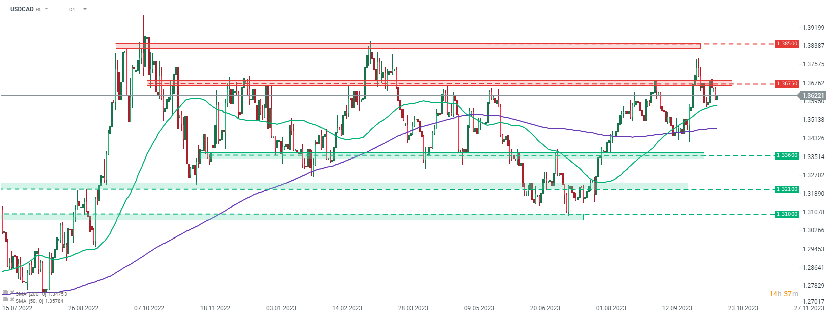 Ha megnézzük az USDCAD D1-es grafikonját, láthatjuk, hogy a pár július közepe óta felfelé kereskedik. Az emelkedő trend meglehetősen stabil volt, kivéve egy szeptemberi kéthetes korrekciót. A közelmúltban azonban némi gyengeséget láthattunk a párban, az USDCAD visszahúzódott a 6 hónapos csúcsról. A csökkenés az 50-es mozgóátlagnál (zöld vonal) megállt, de a pár ezt követően nehezen tudott visszatérni az 1,3675-ös ellenállási zóna fölé. Egy erős amerikai kiskereskedelmi értékesítési jelentés a vártnál gyengébb kanadai CPI-vel kombinálva a fent említett ellenállás teszteléséhez vezethet.