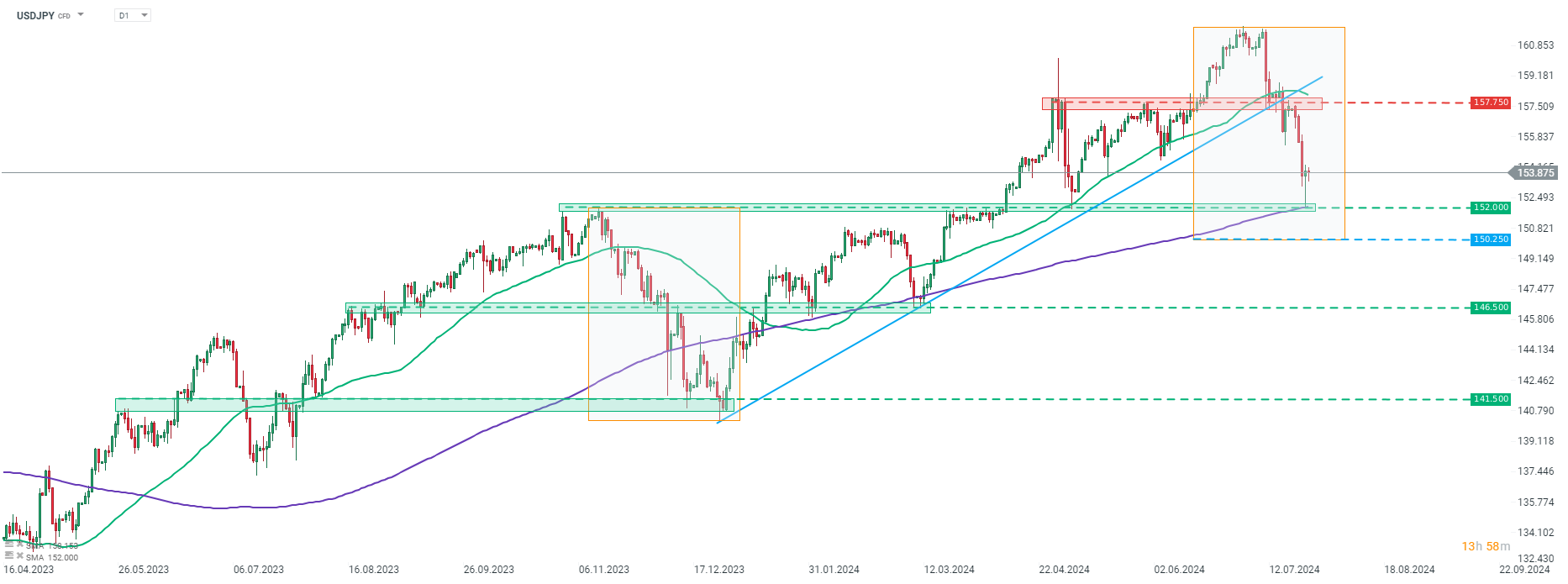 Ha megnézzük az USDJPY D1 intervallumú grafikonját, láthatjuk, hogy a pár körülbelül 5%-kal a július első felében elért rekordmagas értékei alatt kereskedik. A pár tegnap több mint 1% -kal alacsonyabb szinten kereskedett, de sikerült visszaszereznie az összes veszteséget az erős amerikai GDP-adatok közzététele után. Megjegyzendő, hogy a tegnapi napi mélypontot szinte pontosan a 200-as ülés mozgóátlagnál (lila vonal) érte el. E szint sikeres védelme a vevők részéről bullish technikai jelnek tekinthető. A kereskedőknek azonban szem előtt kell tartaniuk, hogy a Fed és a BoJ jövő heti ülései nagy kockázatú események a pár számára, és az USDJPY kereskedése során a jövő hét szerdájáig és szerdáig óvatosság ajánlott.