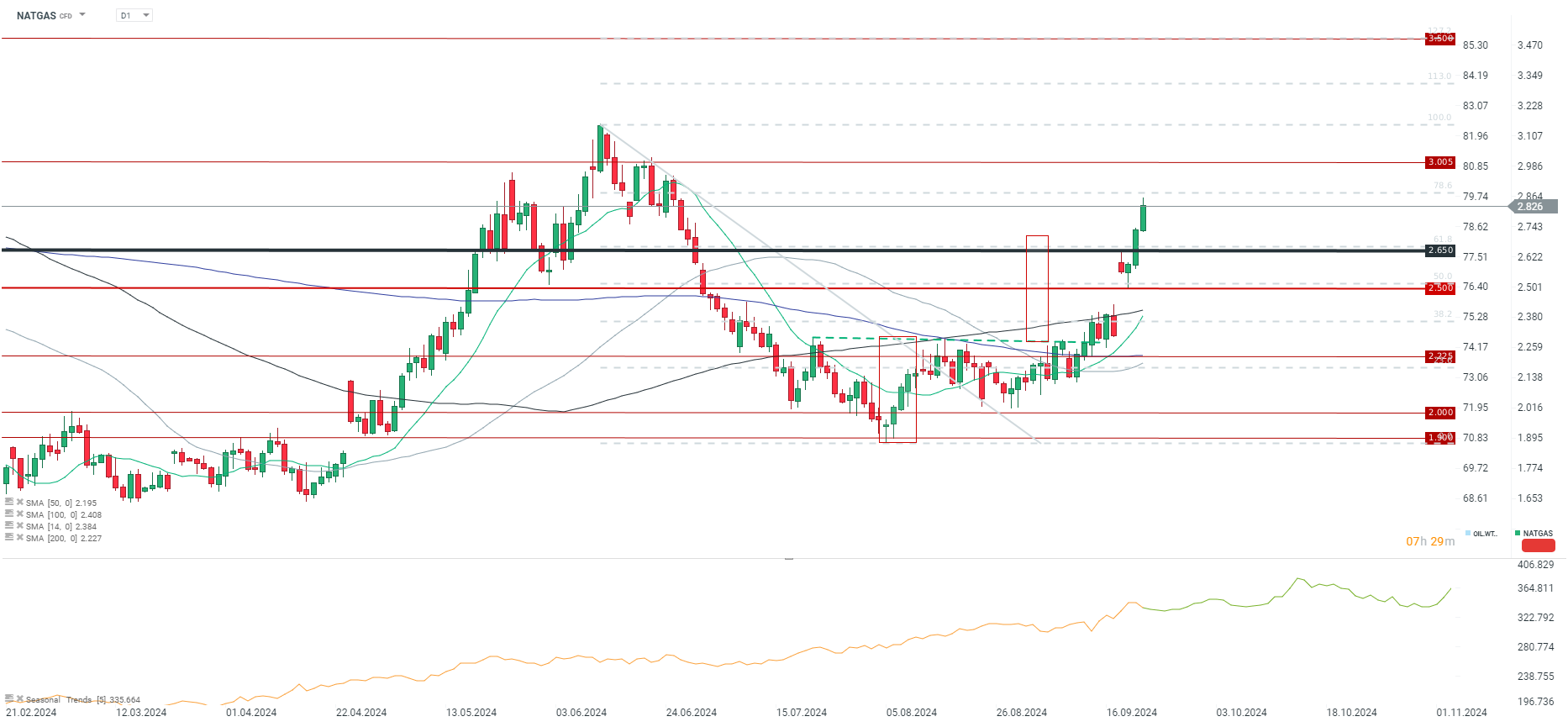 A gáz ára a szeptemberi görgetése után tovább folytatja erőteljes emelkedését. Tavaly ugyanebben az időszakban az átállást követően több mint 20%-os emelkedés volt tapasztalható, mielőtt október második és harmadik hetében korrekció következett be. Forrás: xStation5
