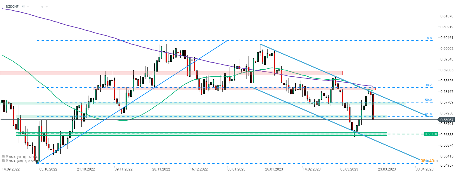Taking a look at NZDCHF chart at D1 interval, we can see that the pair has been trading in a downward channel since late-January 2023. The pair experienced strong gains between March 12 and March 19, 2023 with NZDCHF bouncing off the 0.5635 support zone near the lower limit of the channel and climbing towards the upper limit in the 0.5825 area. However, bulls encountered a mix of resistances there - previous price reactions, 50-session moving average (green line) and 38.2% retracement of the upward move launched in October 2022 - and the pair started to pull back. A supply side reaction to the aforementioned resistances as well as a strong downward move we are observing today gives hope that the pair may be set for another test of the 0.5635 support and a lower limit of the channel.