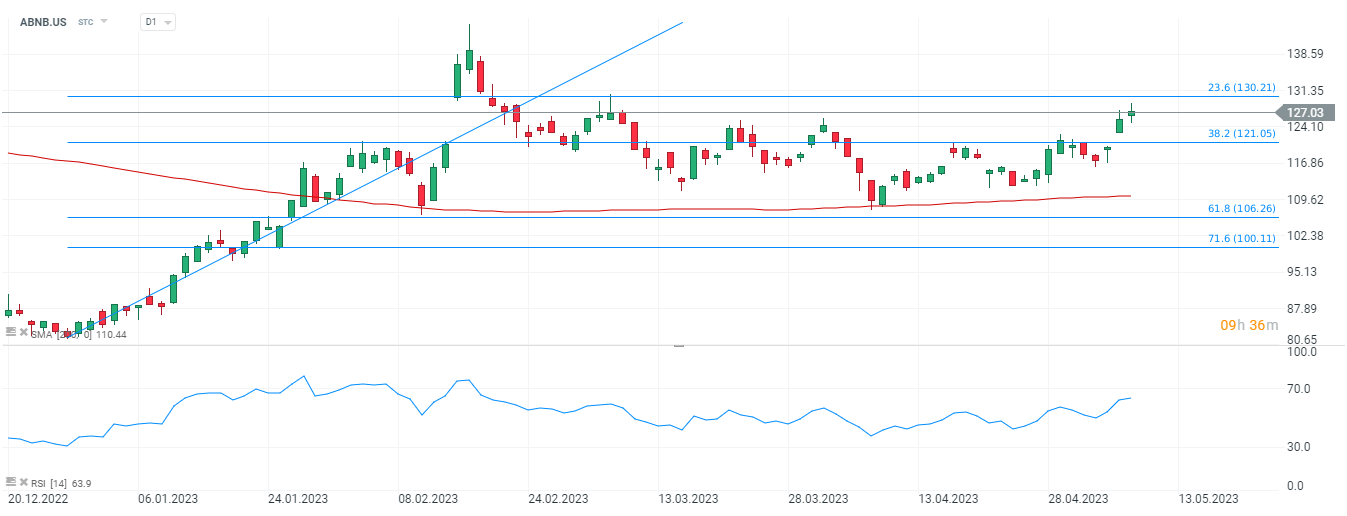 Shares of travel company Aribnb (ABNB.US) are losing nearly 10% today despite the company reported stronger than expected results for Q1. At the same time, it presented a rather cautious outlook for the second quarter of the year. The Q2 historically, along with Q3, has been the most successful for its business due to a summer season favorable to travel demand. Investors are concerned that possible consumer weakness will limit growth potential later in the year. At the same time, Q1 2023 was the first profitable quarter in the company's history.