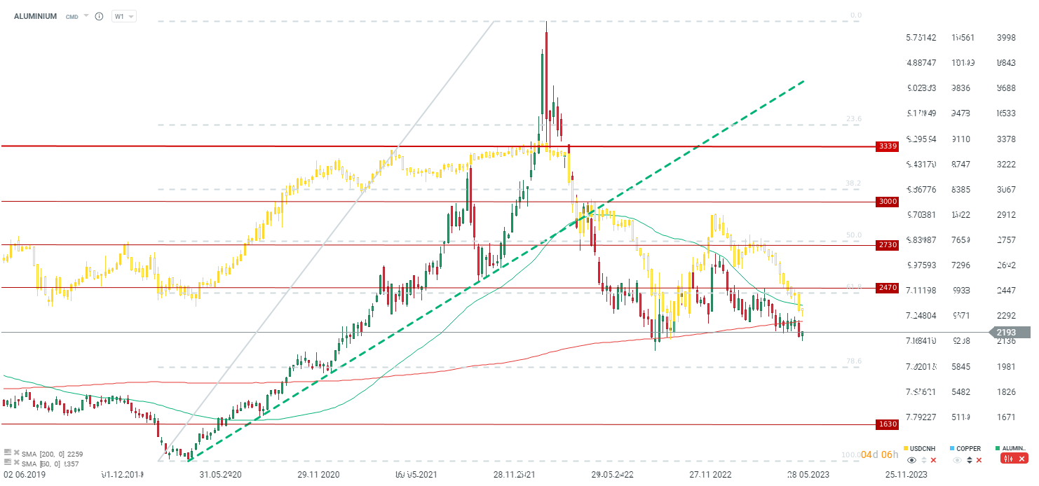 Aluminium and other assets that are closely linked to the situation in China gained following a speech of Chinese Prime Minister at the World Economic Forum in Beijing, China. He pointed that GDP growth in Q2 2023 should be higher than in Q1 and that additional stimulus measures should be announced in July.