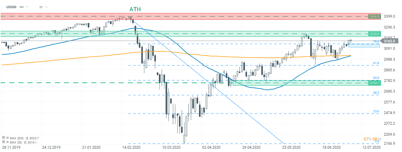 Recently S&P 500 (US500) broke above 78.6% Fibo retracement of the February-March sell-off and rushed towards 3,230 pts area. This barrier serves as a key resistance now as it is marked with the June’s high. S&P 500 is trading slightly lower at press time. Nasdaq is a proof that market bulls are slowly regaining control as the index is adding roughly 0.50% at press time. Chances are that S&P 500 will finish the session higher as well. Source: xStation5