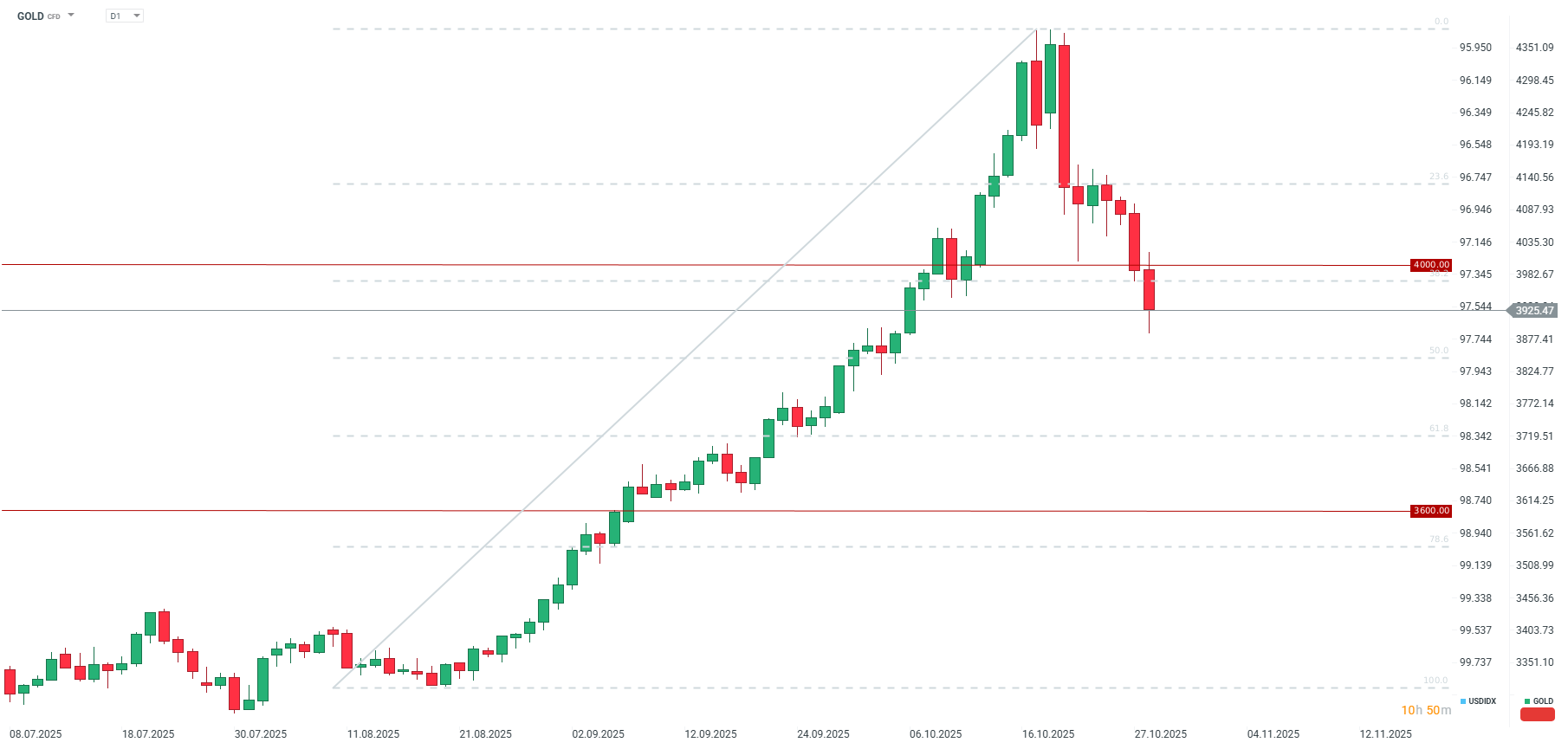 Az arany legfontosabb technikai támaszpontja 3850 dollár körül van, ahol a 50,0%-os Fibonacci-visszatérés és a hónap eleji szintek találhatók. Forrás: xStation5