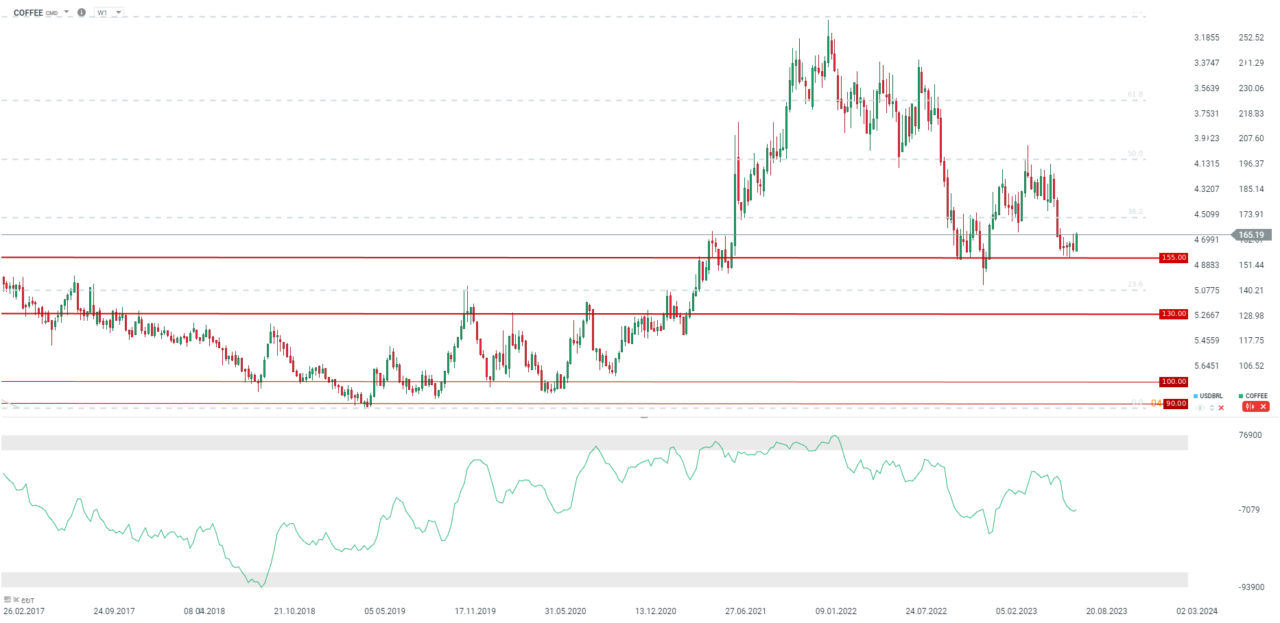 A Kávé ezen a héten néhány hetes oldalazás után fellendül. Amennyiben az ár visszatér a 160 cent/bushel területre, akkor kísérletet tehetünk arra, hogy a jelenlegi csökkenő tendenciában újabb lábat fessünk lefelé. Forrás: xStation5
