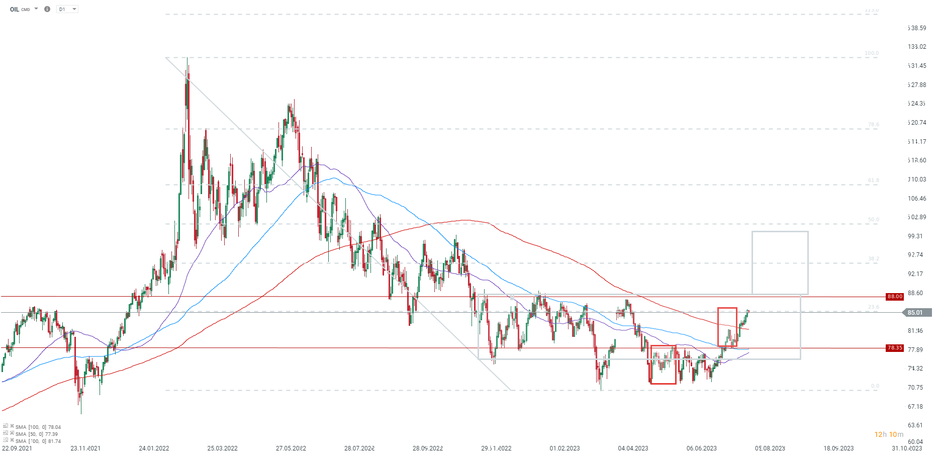 Az olaj kiterjeszti a közelmúltbeli nyereséget, és közel áll a május-júliusi kereskedési tartományból való kitörés eléréséhez. Hacsak a világgazdaság nem esik recesszióba és az USD nem gyengül ezt követően, nem zárható ki, hogy az olajárak megpróbálják elérni a hordónkénti 90-100 dolláros területet. Forrás: xStation5