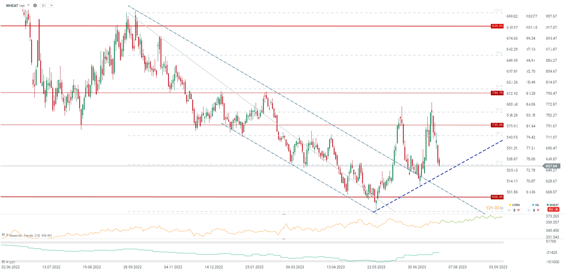A búzaárak továbbra is csökkennek, de a pozícionálási adatokra pillantva láthatjuk, hogy a nettó pozícionálás növekedését a rövid pozíciók zárása okozza. A szezonális minták azt mutatják, hogy szeptember elején az árak emelkedésére kell számítanunk. A legközelebbi támasz zóna a 640-645 cent/persely tartományban található. Forrás: xStation5
