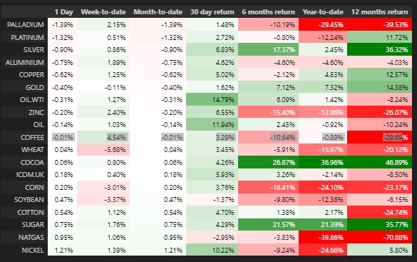 Az árutőzsdei árak alakulása. A kávé árfolyama a hét eleje óta emelkedik, de az elmúlt 30 napban alulteljesít a széles árupiacon. Forrás: A kávé árfolyamának alakulása az elmúlt hetekben nem volt jelentős: XTB Research