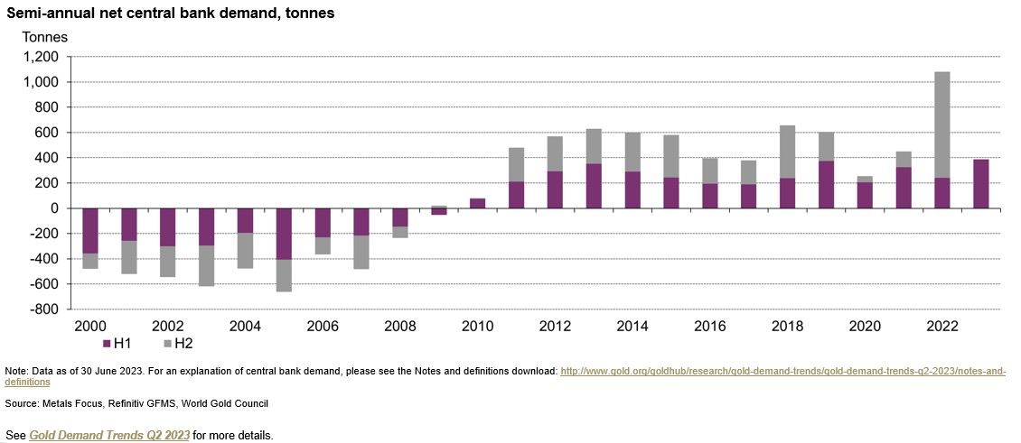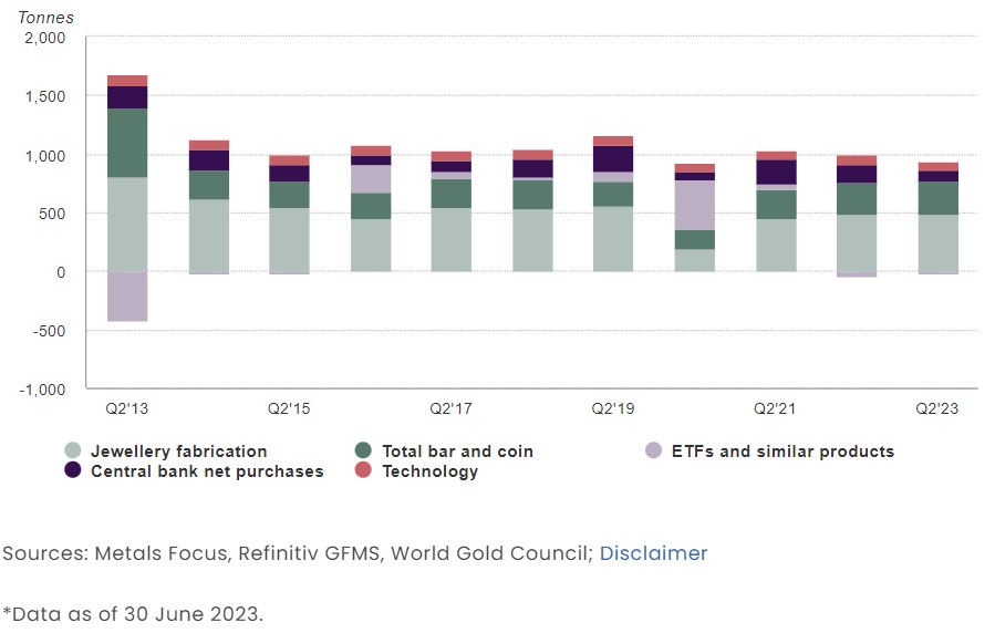 A központi bankok kereslete 2023 második negyedévében jelentősen visszaesett 2023 első negyedévéhez vagy 2022 második negyedévéhez képest. Mindazonáltal a kereslet 2023 egész első felében nagyon erős volt. Forrás: World Gold Council (Arany Világtanács)