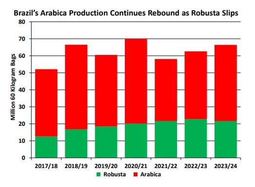 - A világ kávétermelése várhatóan 4,3 millió zsákkal nő a korábbi szinthez képest, és a 2023/2024-es szezonban 174,3 millió zsákot ér el, elsősorban a brazil és vietnami termelés növekedésének köszönhetően.