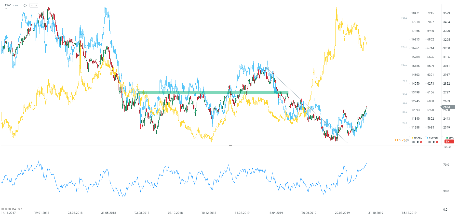 A csökkenő készleteknek köszönhetően a cink az elmúlt hetekben szilárd árnövekedést tapasztalt. Annak ellenére, hogy a cinkkészletek ugyanúgy csökkennek, mint a nikkelkészletek, a cink ára inkább úgy viselkedik, mint a réz. Forrás: xStation5