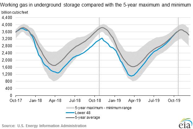 Az amerikai gázkészletekkel kapcsolatos legfrissebb jelentés szerint a szint már meghaladta az 5 éves átlagot. Ráadásul az időjárás-előrejelzések a következő hónap elejére alacsonyabb hőmérsékletet jósolnak. Forrás: KHV