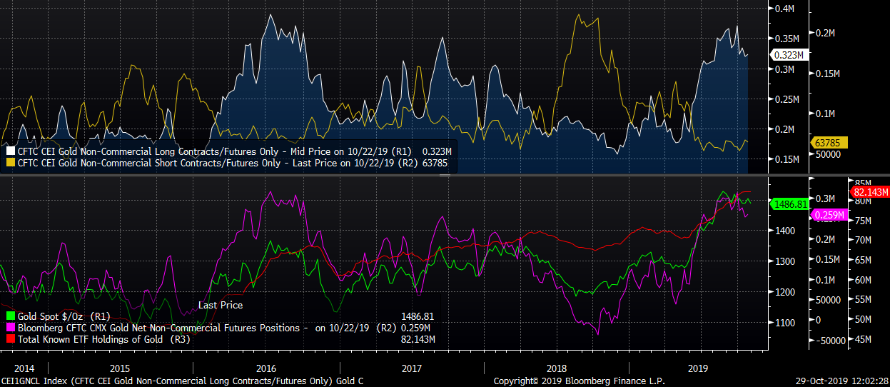 Az ETF-ek is többnyire magasan vannak, de a növekedés a közelmúltban mérséklődött. Másrészt a rövid pozíciók száma rendkívül alacsony, ami egy rövidtávú szignál lehet az ellentétes kereskedések számára. Forrás: Bloomberg