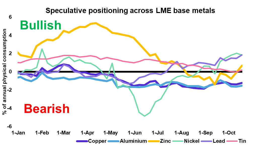 A cink spekulatív pozicionálása a medvék felé kacsingat, ami a készletek jelentős csökkenését okozhatja. Forrás: Bloomberg, Orchid Research
