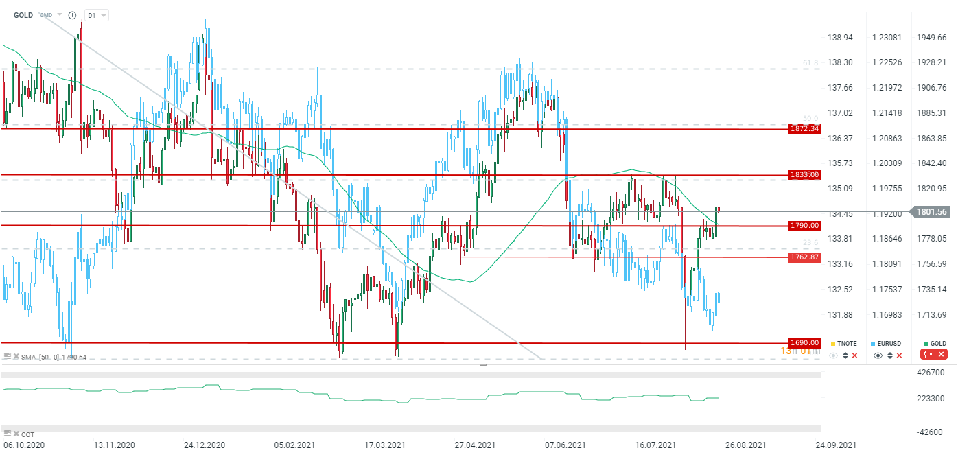 If the gold price manages to hold above $1,800 per ounce and the 50-session moving average, the next target for bulls will be $1,833 area. Large divergence between gold price moves and EURUSD remains. Source: xStation5