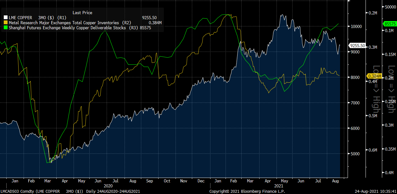 Levels of copper inventories around the world begin to stabilize (yellow line). Inventories in China continue to fall (green line, inverted axis). Source: Bloomberg