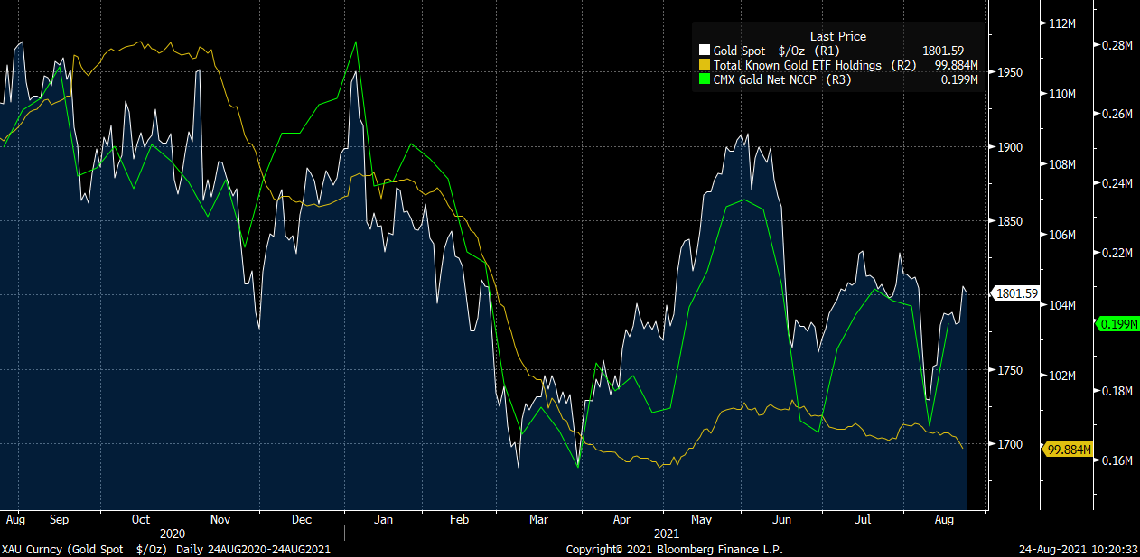 ETFs are selling out gold holdings. However, net speculative positioning on gold futures rebounded. Source: Bloomberg