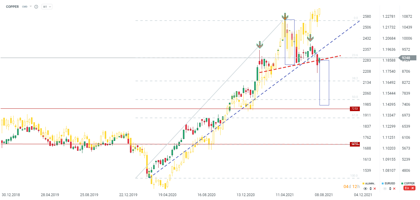 Copper price tries to climb back above the neckline of head and shoulders pattern. Should it succeed, it may be able to "catch up" with other industrial metals, like aluminium. Source: xStation5