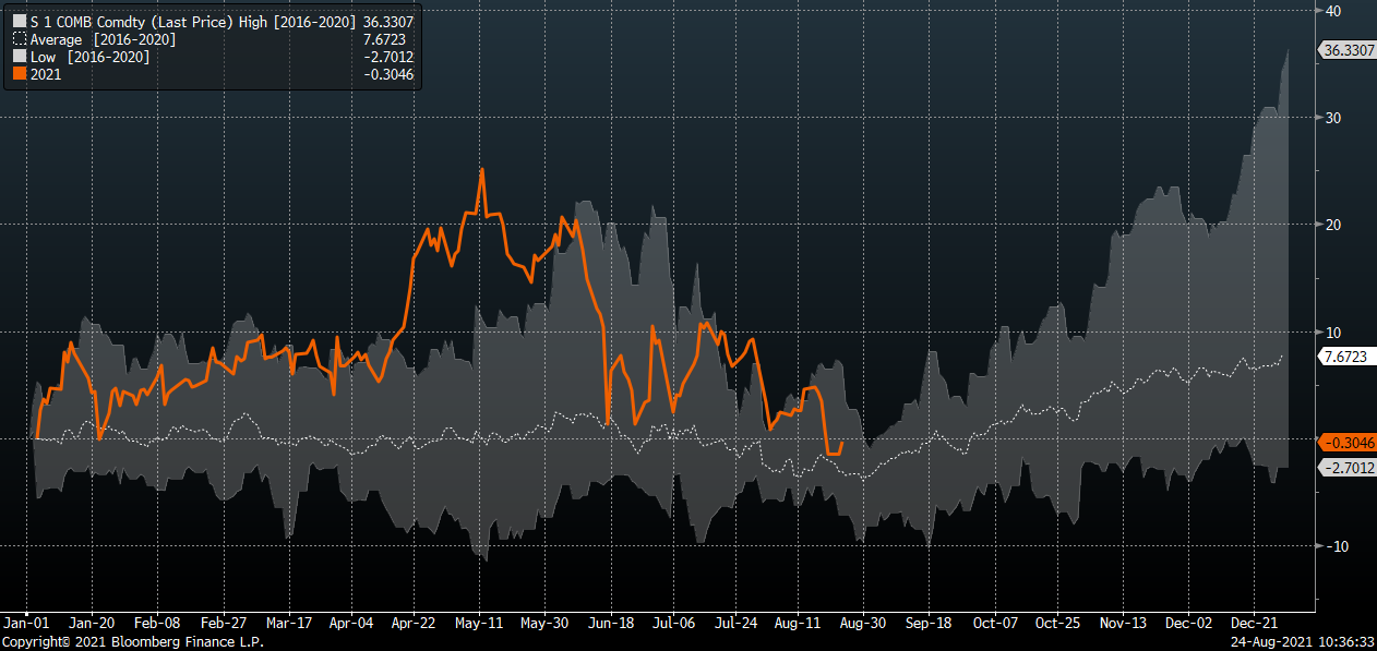 Additionally, awaited rainfall in the corn and soybean production regions improves outlook for this year's production (harvest starts in a few weeks)
