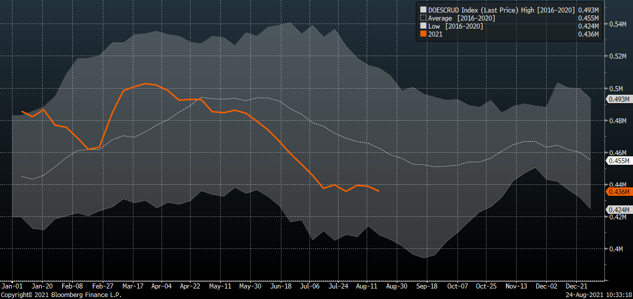 Oil inventories dropped once again but a seasonal low should be reached in mid-September. Source: Bloomberg