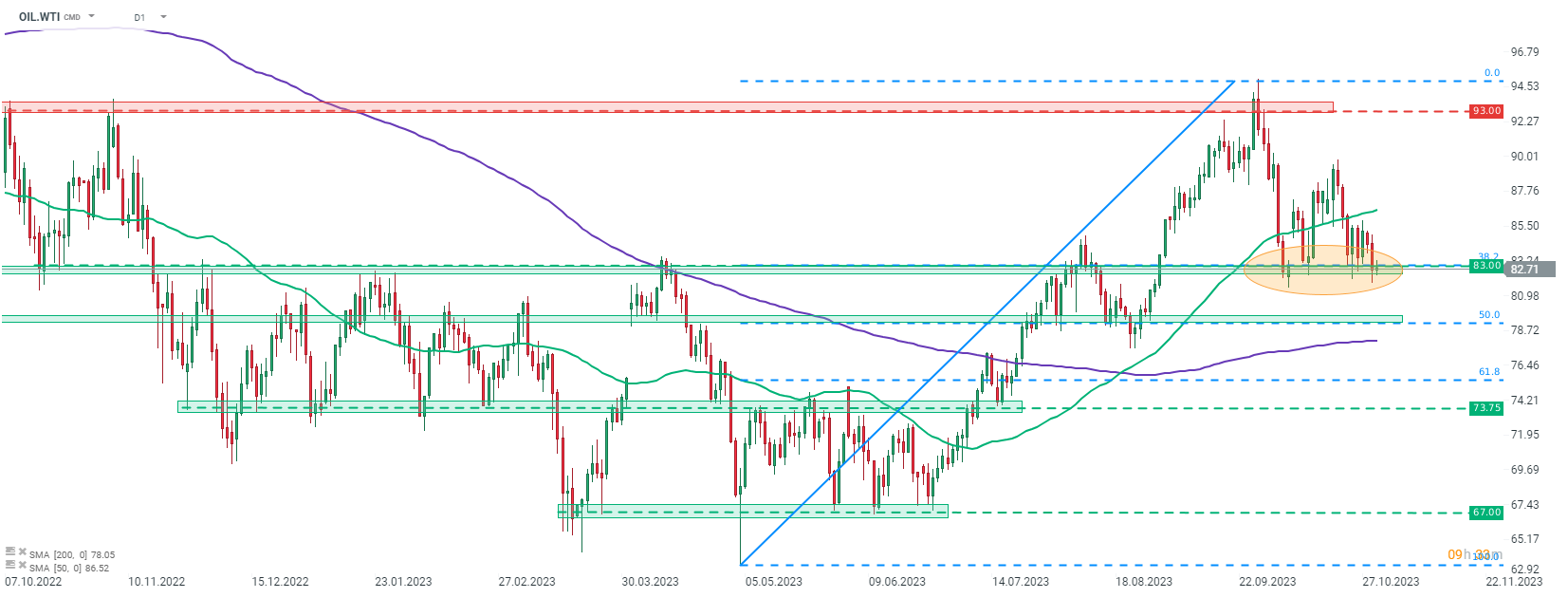 A WTI (OIL.WTI) az új hét elején visszahúzódott, és ismét a hordónkénti 83 dolláros támasz zónát teszteli, amelyet a 2023. május elején elindított felfelé irányuló mozgás 38,2%-os retracementje jelöl. E terület alatti áttörés megnyitná az utat a 79,25 dolláros zónában lévő 50%-os retracement felé történő esés előtt. Forrás: xStation5