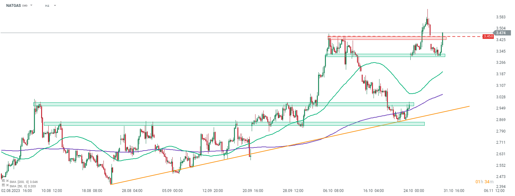 A NATGAS 2023. január közepe óta a legmagasabb szintre emelkedett, miután az előző hét végén a szerződéseket átforgatták. A nyereség egy része azonban tegnap eltűnt, mivel a melegebb időjárási előrejelzések nyomást gyakoroltak az árakra. Mindazonáltal a bikák ma visszanyerik az irányítást a piac felett, mivel a földgáz ára ismét 3,45 USD/MMBTu fölé emelkedett. Forrás: xStation5