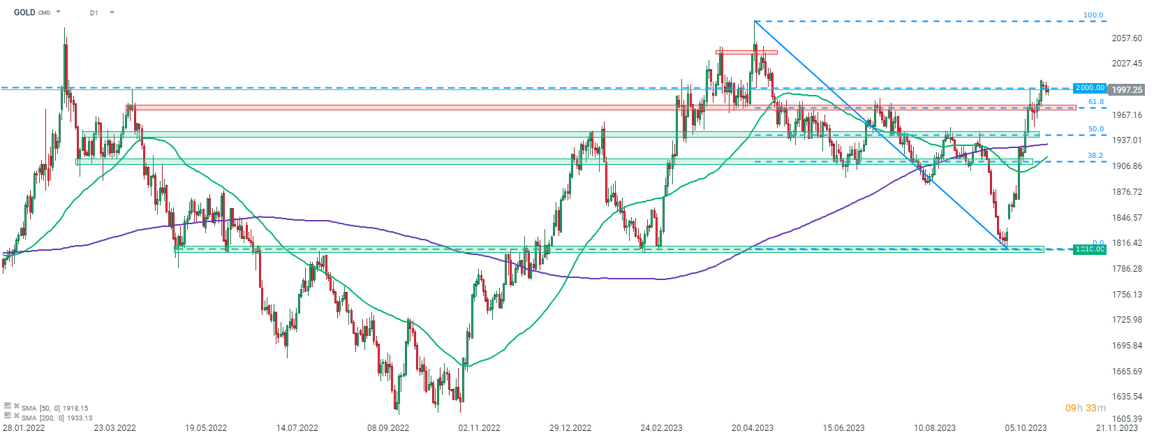 Az ARANY a múlt héten 2000 dollár fölé emelkedett unciánként, 2023 május közepe óta először. A nemesfémek a kötvényhozamok emelkedése ellenére erősödnek. A nagy központi bankok e heti dovish üzenete (FOMC és BoE) üzemanyagot adhat egy tartósabb áttöréshez e kulcsfontosságú pszichológiai terület fölé. Forrás: xStation5